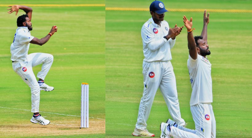 കേരളത്തിന്റെ ഓപ്പണർ അക്ഷയ് ചന്ദ്രൻ സംപൂജ്യനായി പുറത്തായപ്പോൾ ബാബ അപരാജിത് ആറ് റൺസാണ് എടുത്തത്. എം.ഡി നിധീഷ് അഞ്ച് വിക്കറ്റുകൾ വീഴ്ത്തി മികച്ച പ്രകടനം കാഴ്ചവെച്ചു. ബേസിൽ എൻ.പി മൂന്ന് വിക്കറ്റുകൾ നേടി.